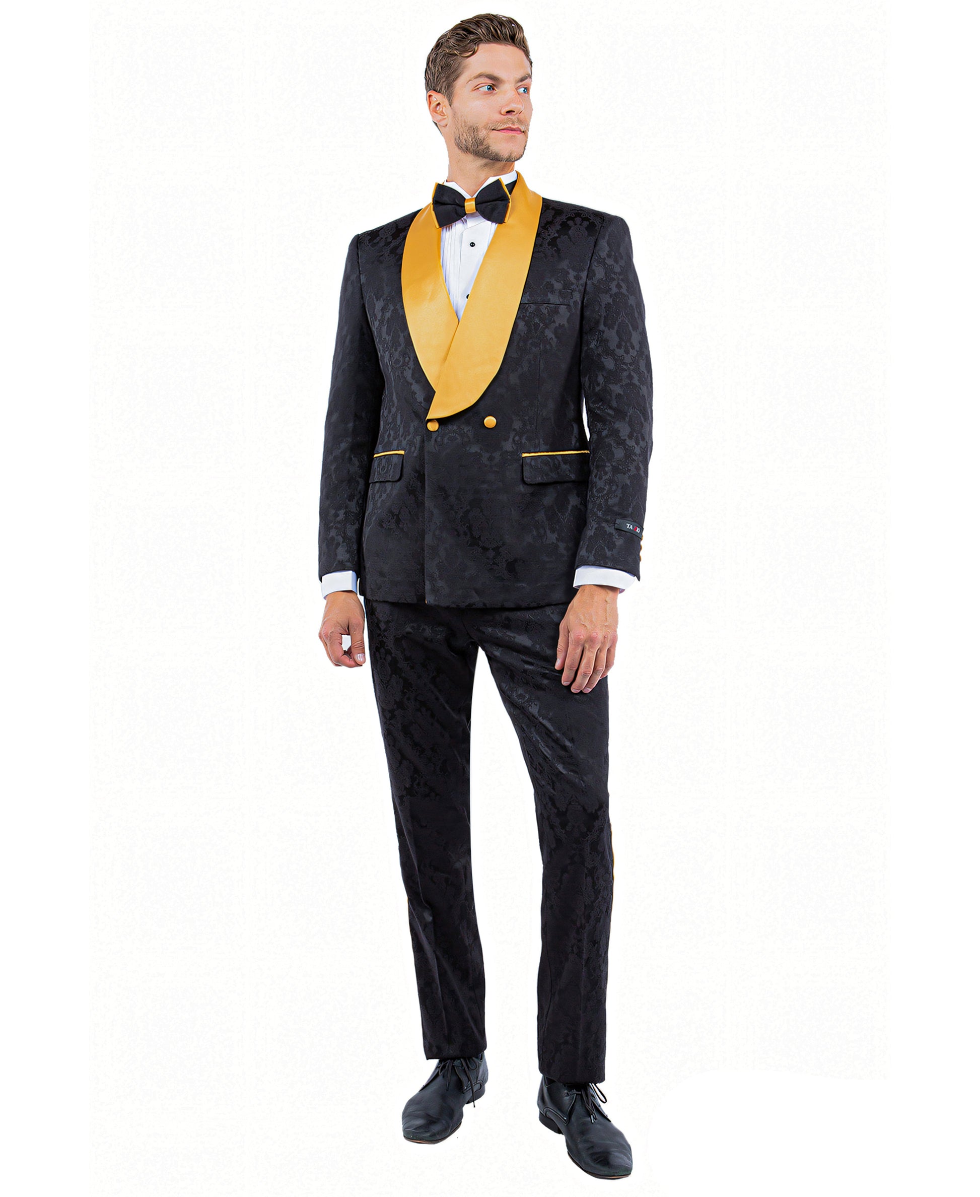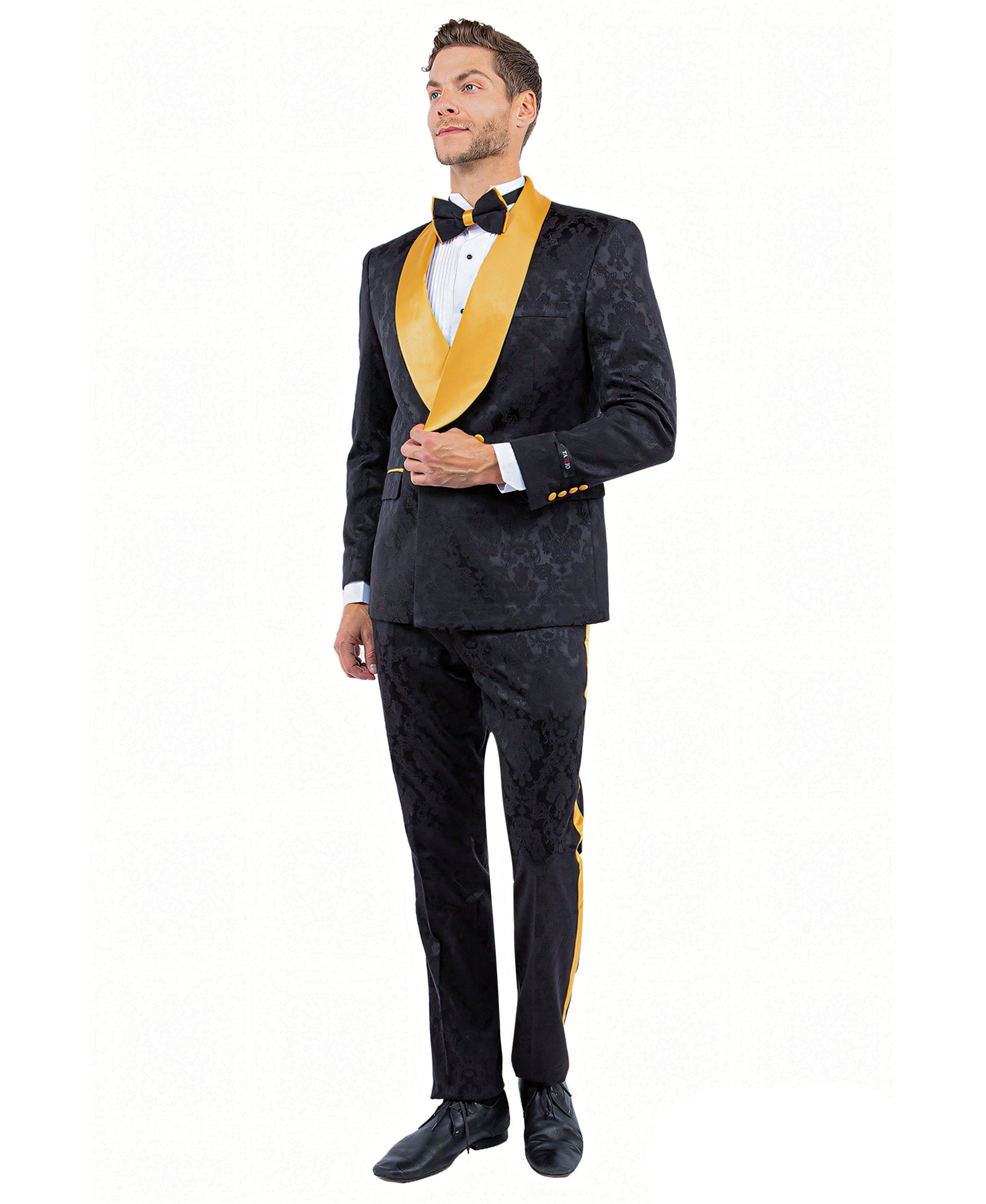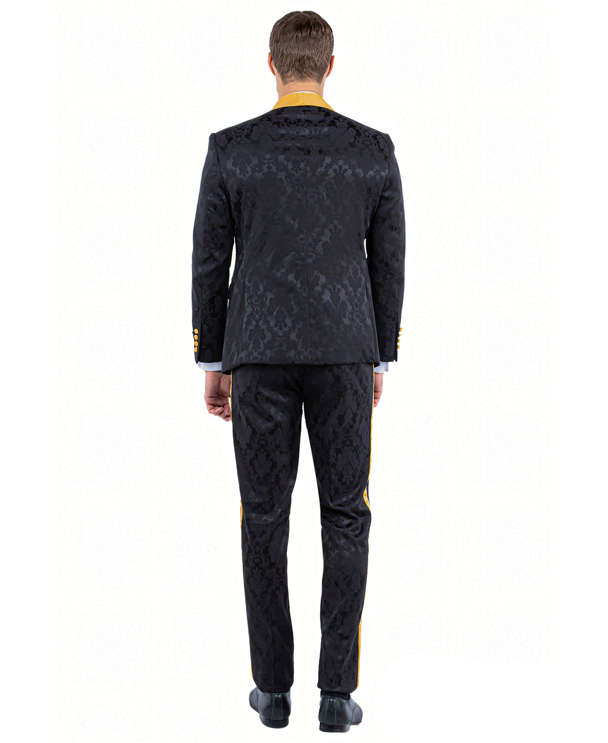 Tazzio Paisley Skinny Fit Shawl Collar Suit, Black & Gold