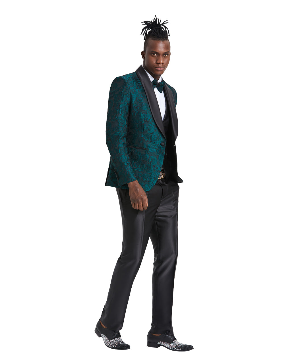 Make an unforgettable impression with the Tazzio Skinny Fit Paisley Shawl Collar Suit. Featuring a luxurious paisley-patterned jacket with a sleek shawl collar and a one-button front closure, this suit is designed for the modern gentleman. The two side-slit pockets offer a stylish touch, while the double-breasted vest and skinny fit pants provide a sharp and dapper finish. With its bold yet refined design, this suit is the perfect choice for any occasion that demands a standout look.