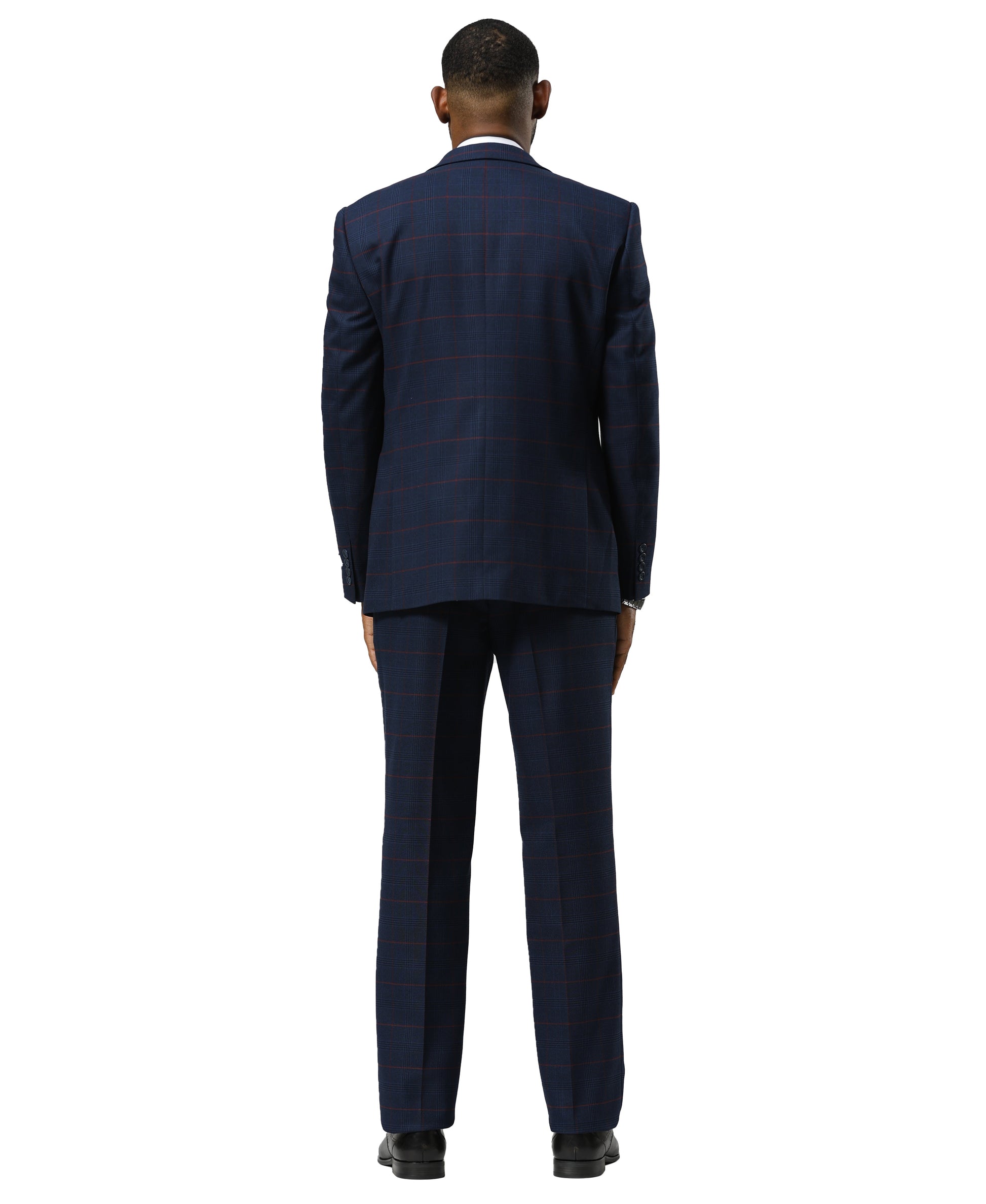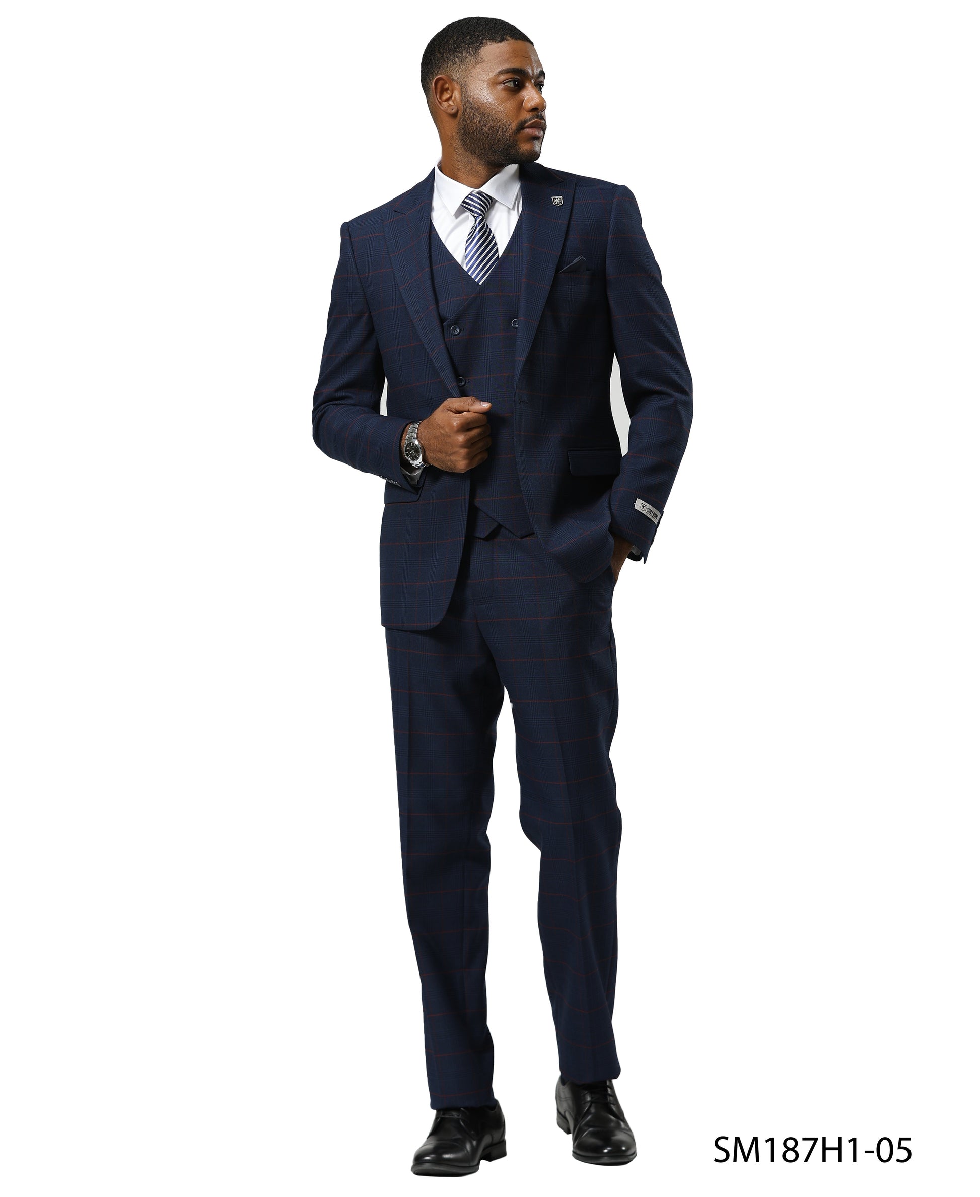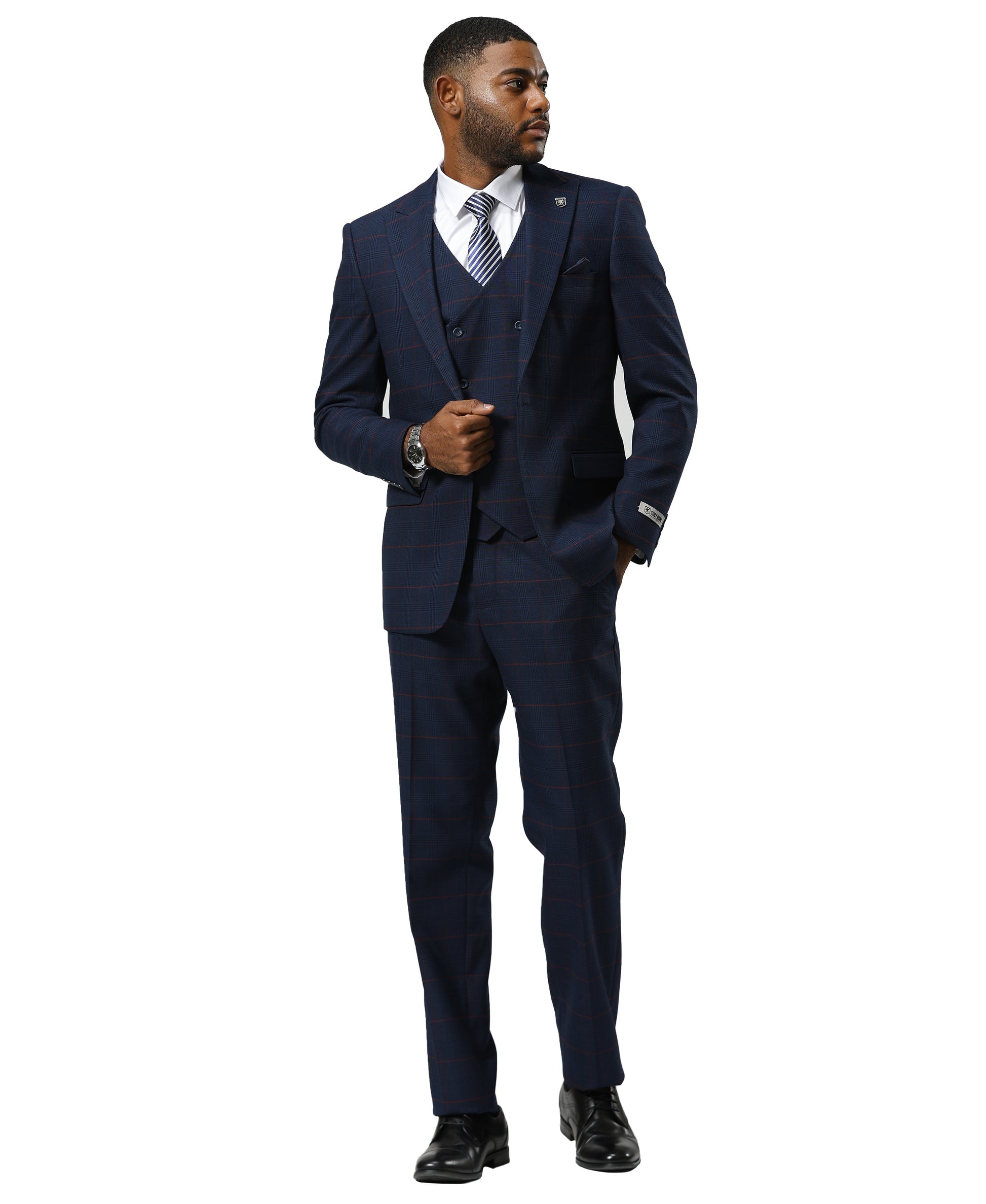 Stacy Adams Windowpane Peak Lapel 3pc Suit Set, Dark Navy