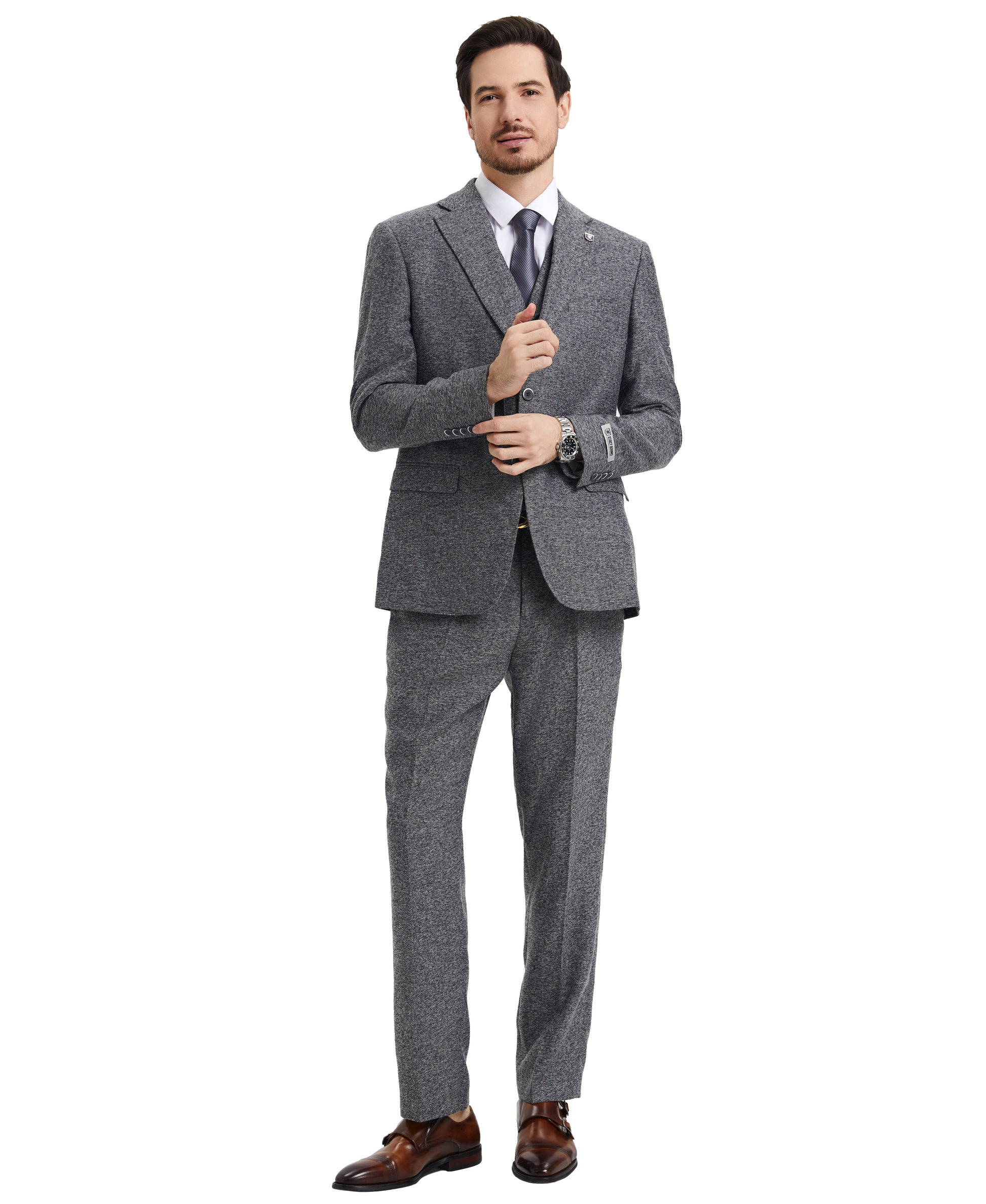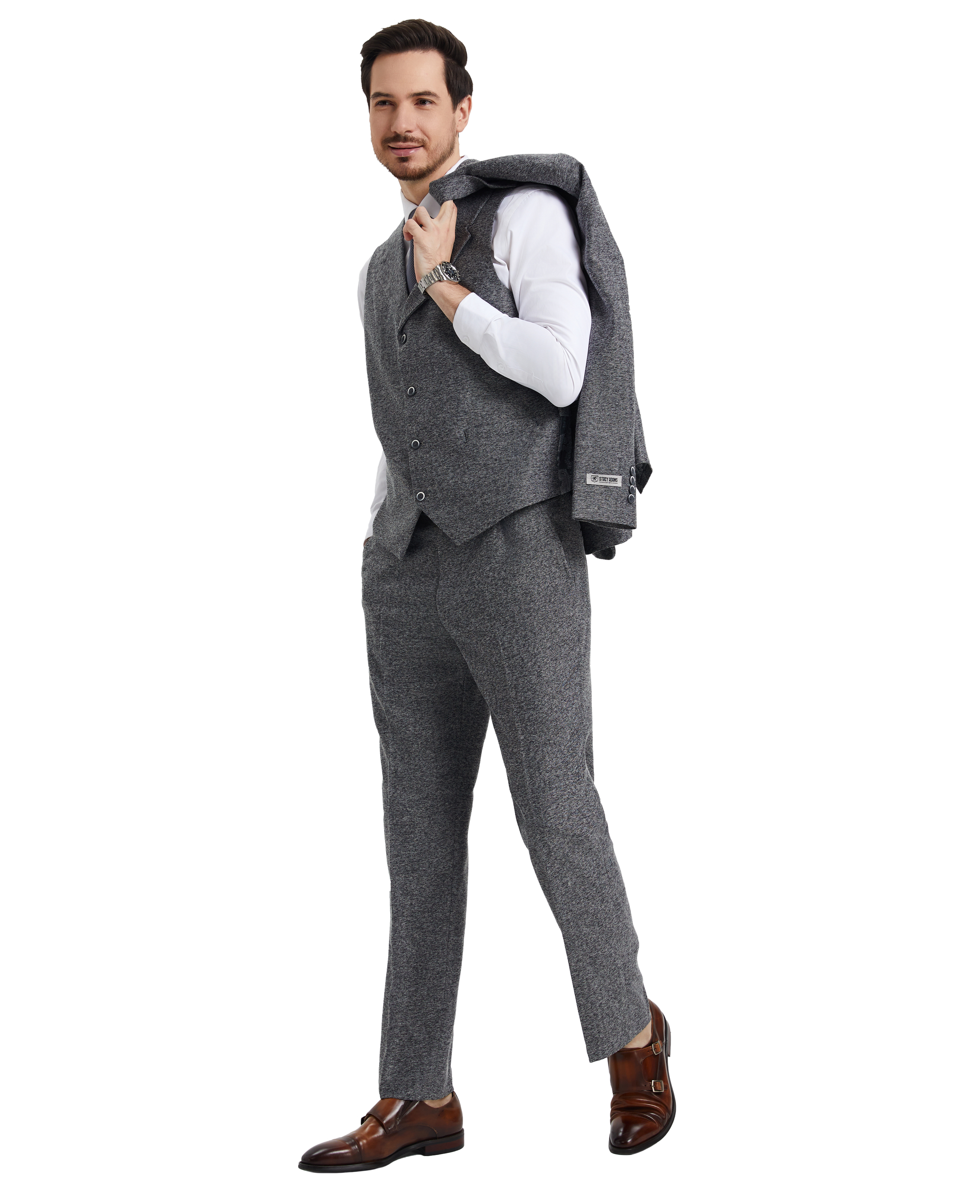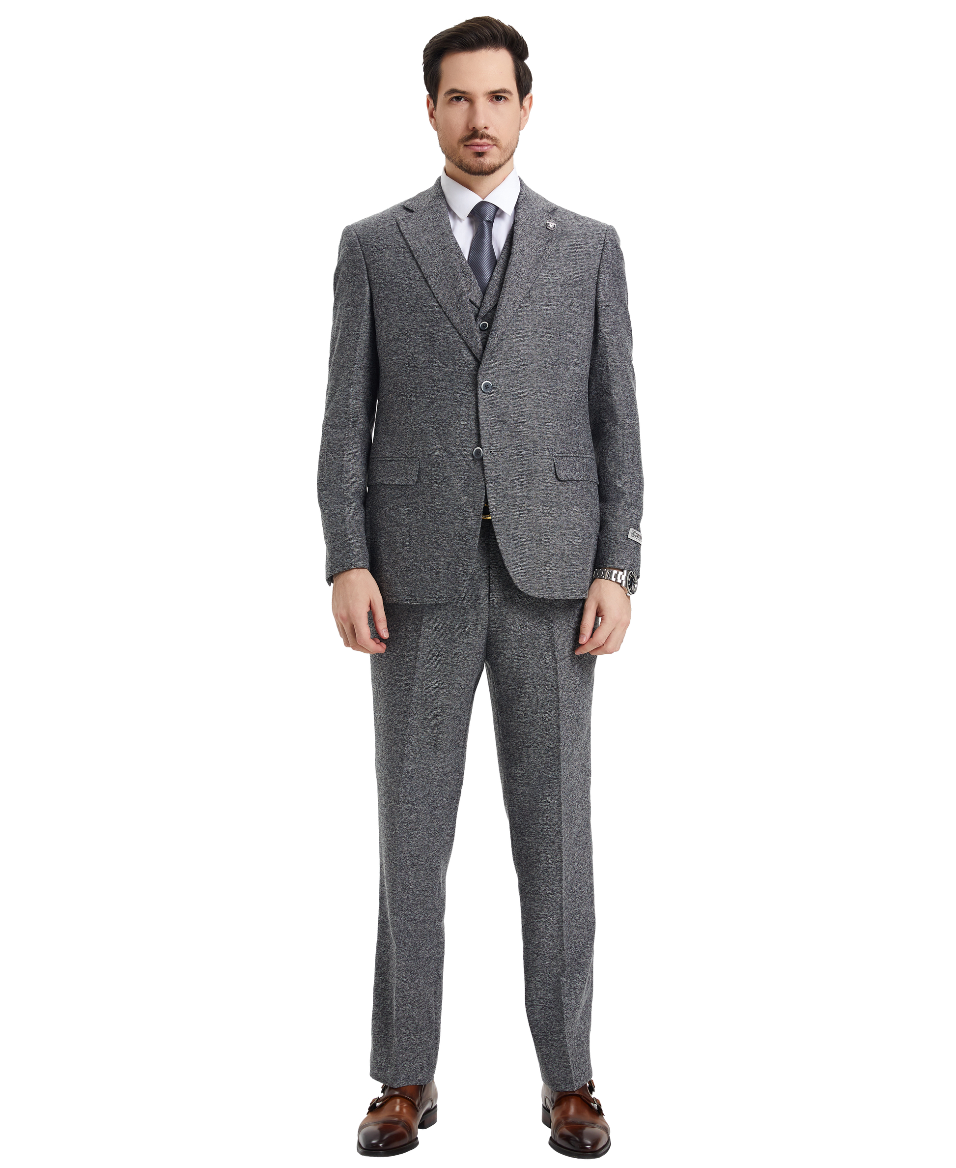 Introducing the Grey Tweed Hybrid-Fit Vested Suit from Stacy Adams. This 3-piece suit with a striking tweed texture is perfect for weddings, formal events, meetings, or evenings. The 2-button closure and notch lapels give a sleek, confident look. Flat front pants and 4-button vest offer versatile style. Timeless grey tweed elevates your wardrobe, expressing unique style. Impress any setting with this high-quality suit.