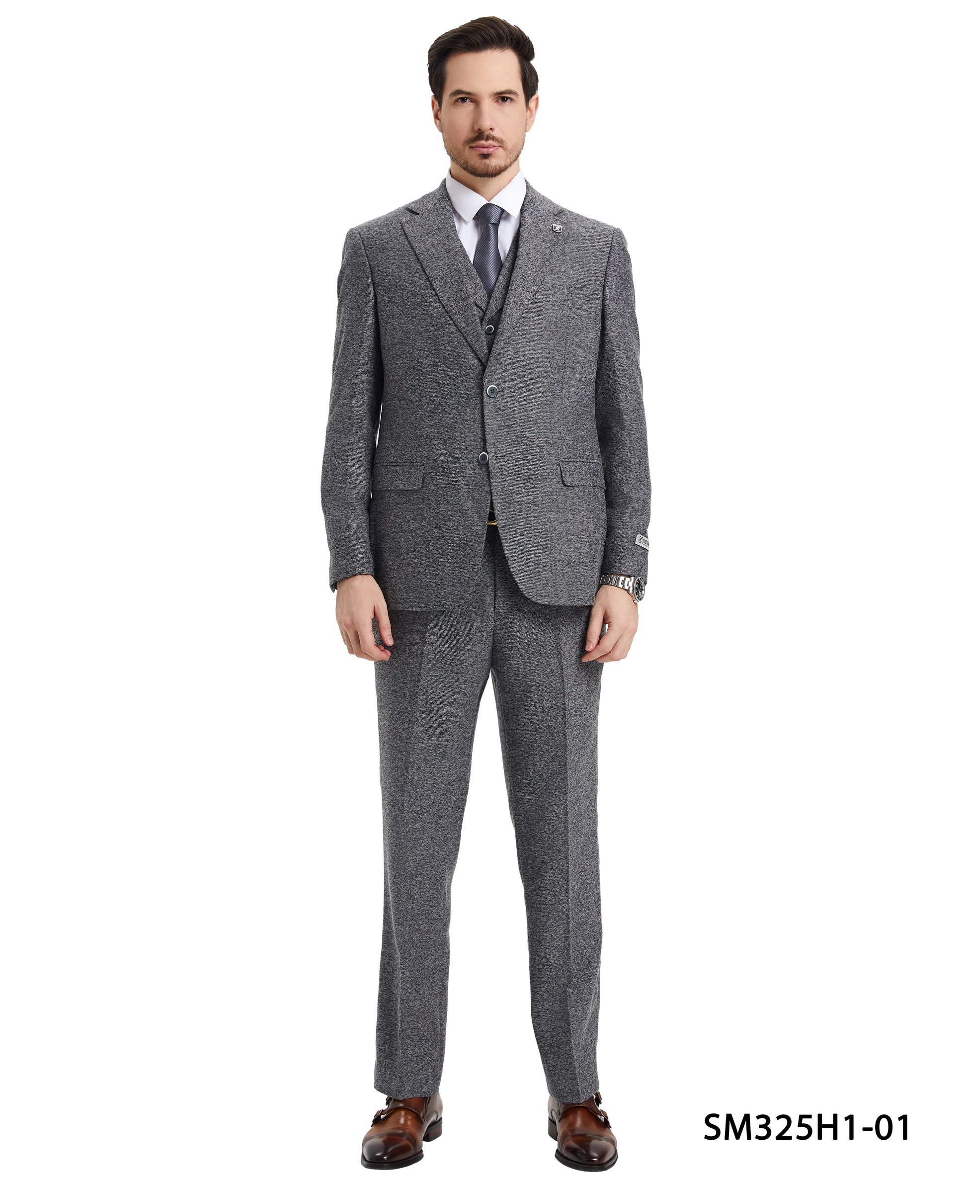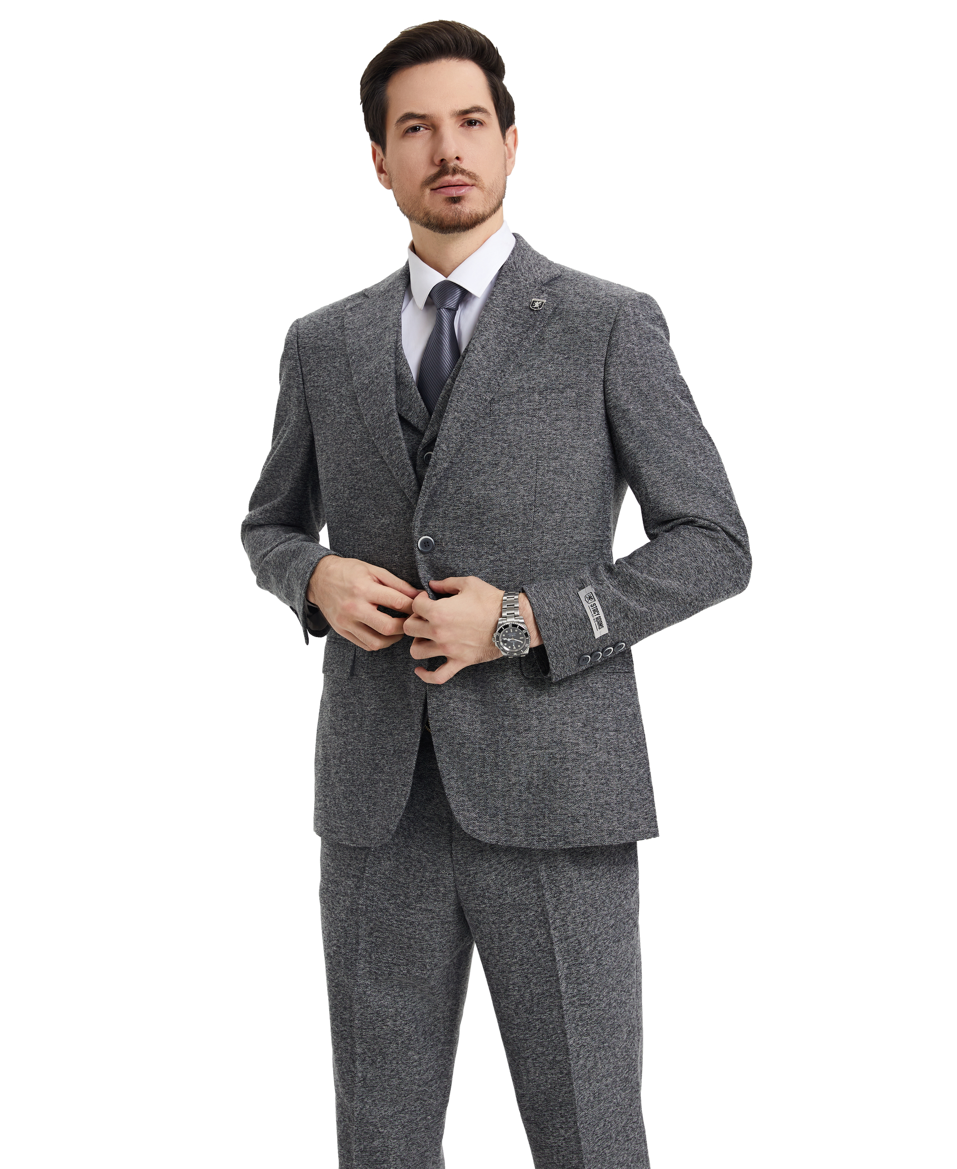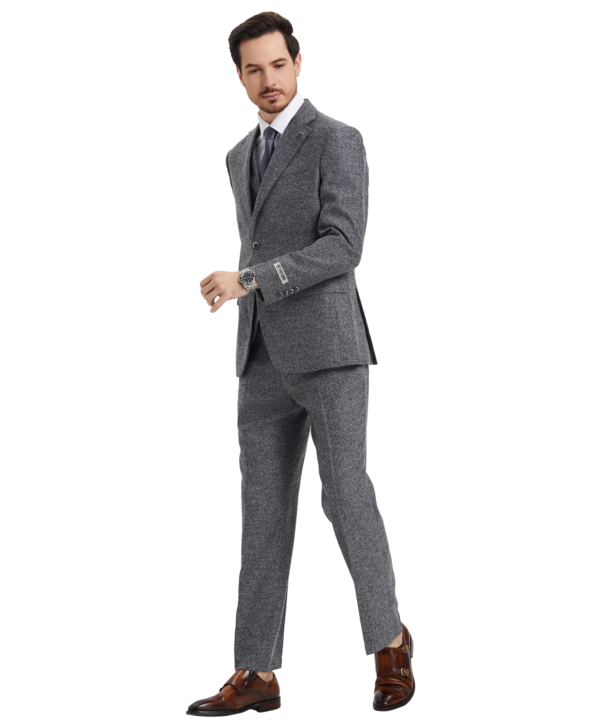 Introducing the Grey Tweed Hybrid-Fit Vested Suit from Stacy Adams. This 3-piece suit with a striking tweed texture is perfect for weddings, formal events, meetings, or evenings. The 2-button closure and notch lapels give a sleek, confident look. Flat front pants and 4-button vest offer versatile style. Timeless grey tweed elevates your wardrobe, expressing unique style. Impress any setting with this high-quality suit.