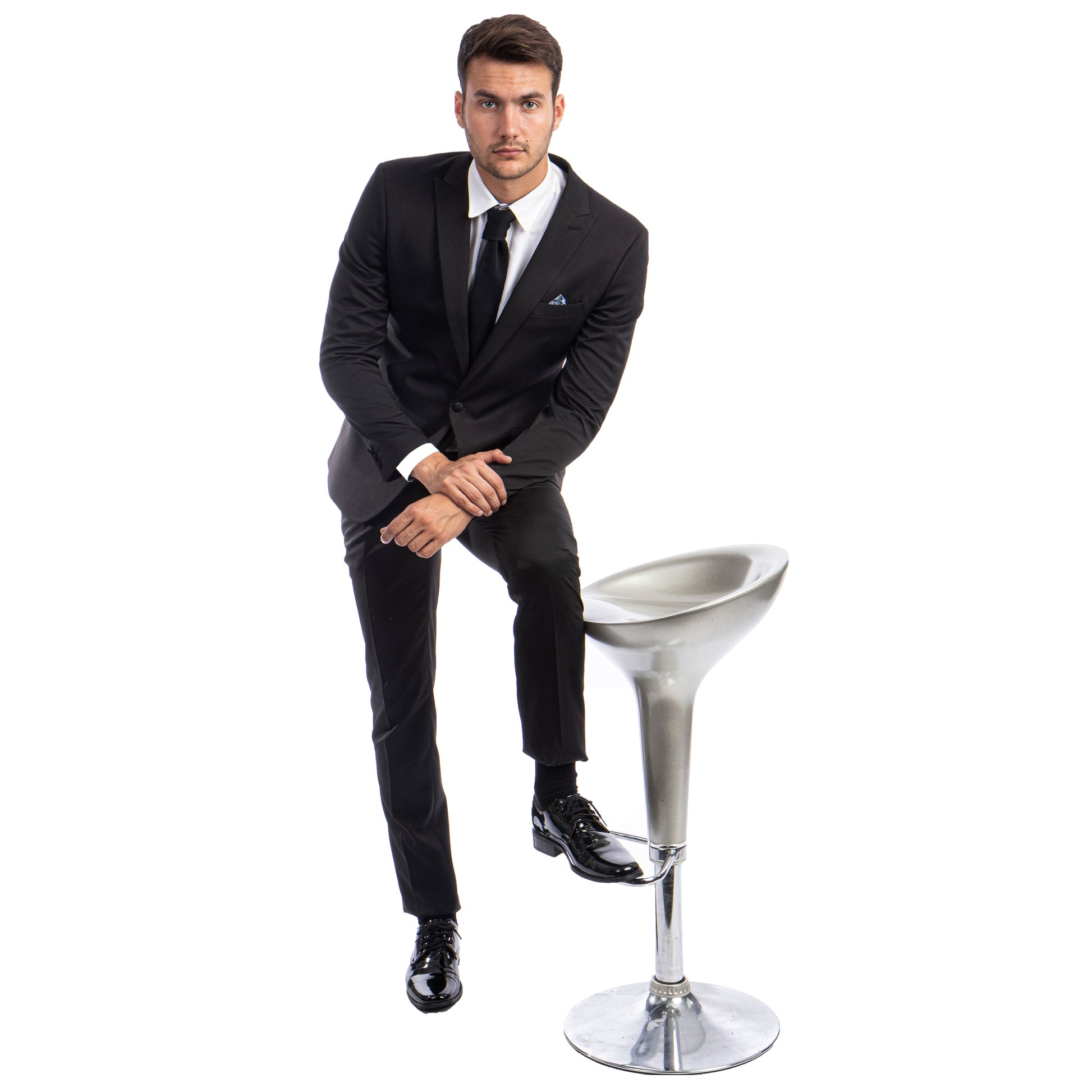 Introducing the Tazzio Men's Skinny-Fit 2pc Suit with Peak Lapel in classic black: a sophisticated ensemble designed for the modern gentleman. With a sleek silhouette, the jacket features a solid design, two-button front closure, and peak lapel, while the pants boast a tailored fit with flat front and extended button closure. Practicality meets style with ample storage options, underarm sweat guards, and a skinny-fitted design that enhances confidence and charm. Perfect for formal events or special occasions, this suit exudes timeless elegance and ensures a lasting impression wherever you go.
