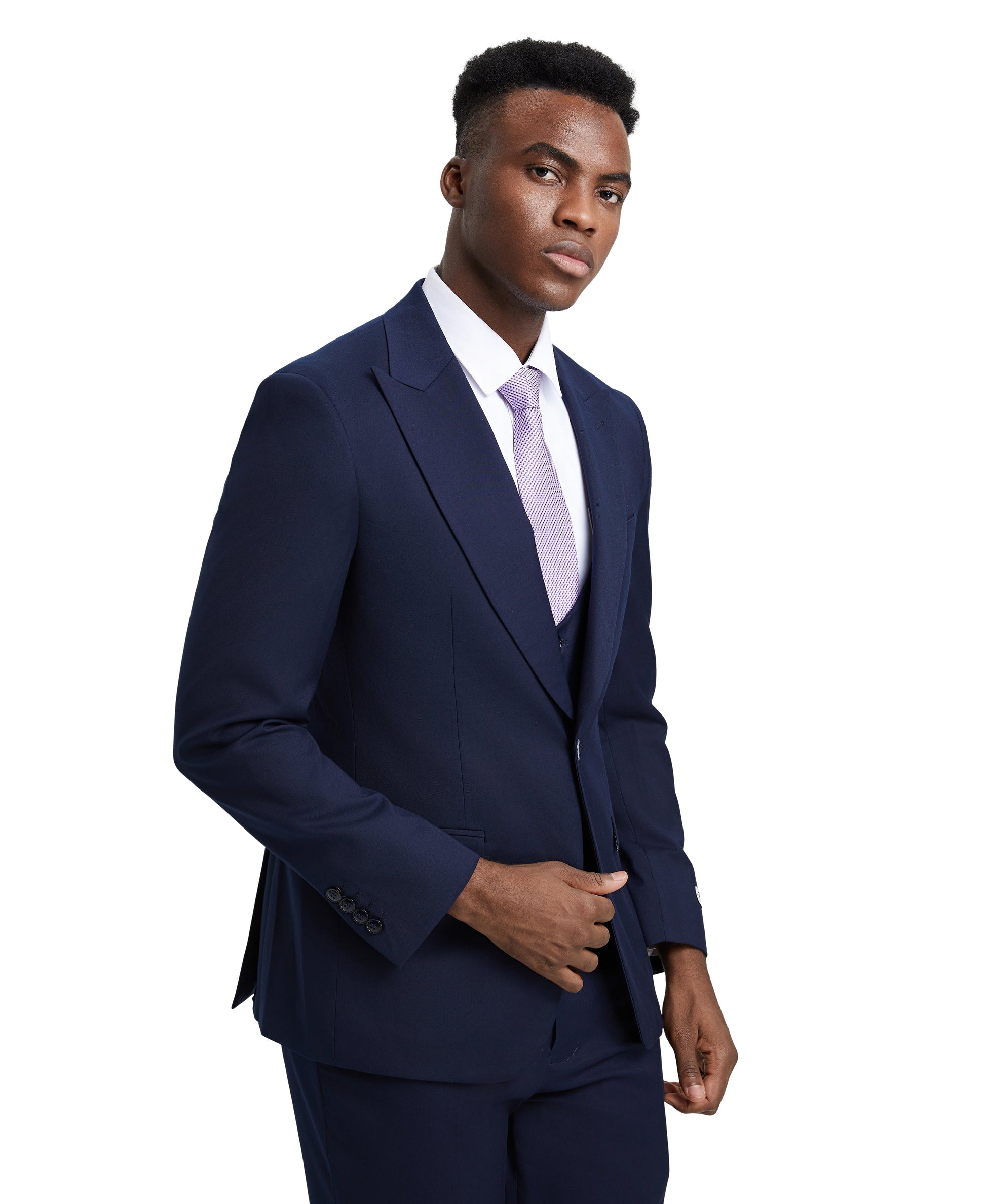 Discover the perfect blend of style and sophistication with the Stacy Adams Hybrid-Fit 3pc Suit Set in elegant dark navy. Crafted for the contemporary gentleman, this suit features a solid dark navy jacket with a two-button front, a sharp peak lapel, and underarm sweat guards to ensure comfort and refinement. The coordinating U-shaped vest in dark navy, with its four-button closure, adds an extra layer of polish. Paired with flat-front pants, these dark navy trousers include an expandable waistband and practical pockets for everyday versatility. Whether you're looking for slim-fit sizes 36-44 or modern-fit sizes 46-62, this set is designed to deliver a tailored fit and a sharp, confident look for any occasion. Elevate your presence with the Stacy Adams Hybrid-Fit 3pc Suit Set in dark navy.