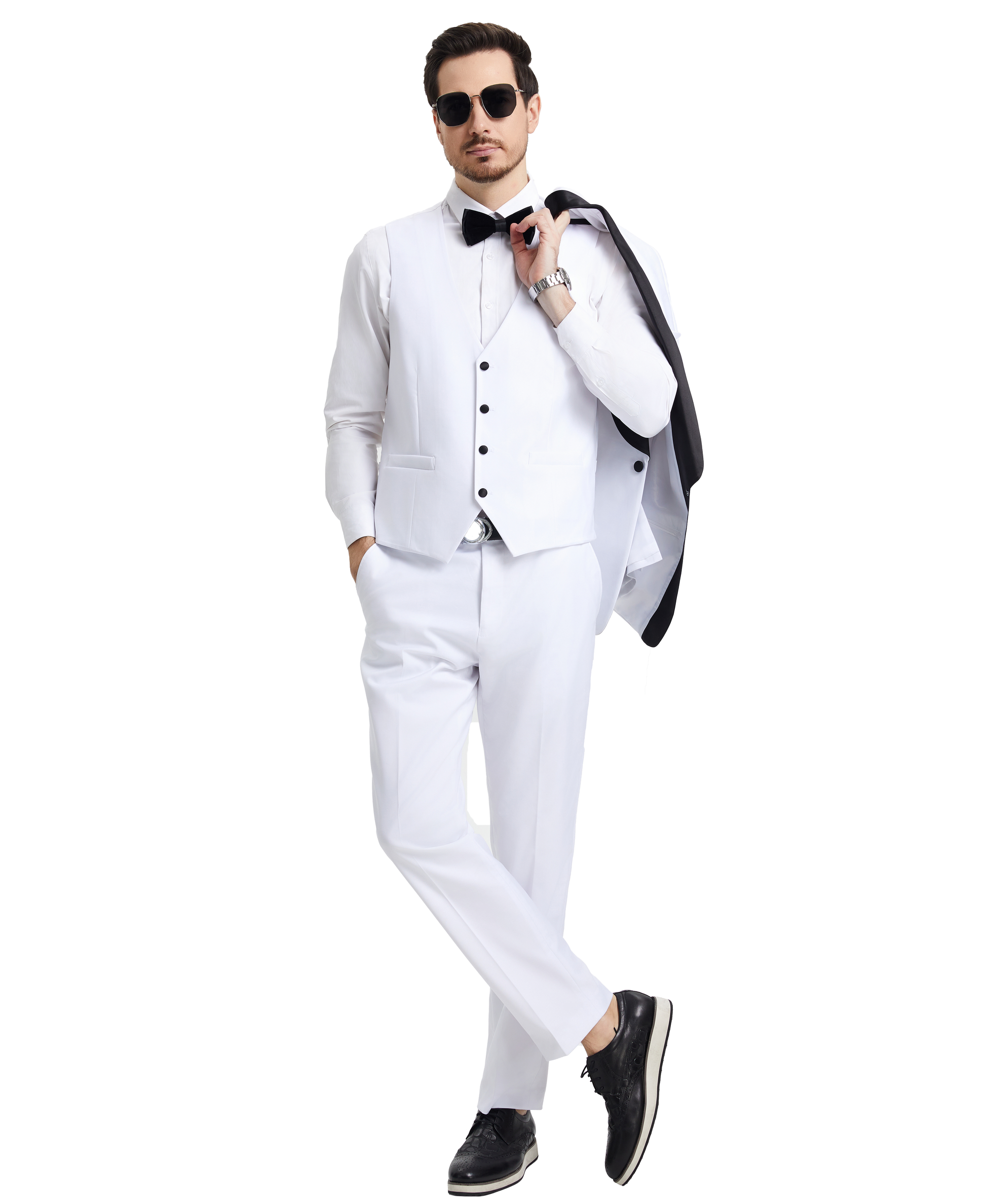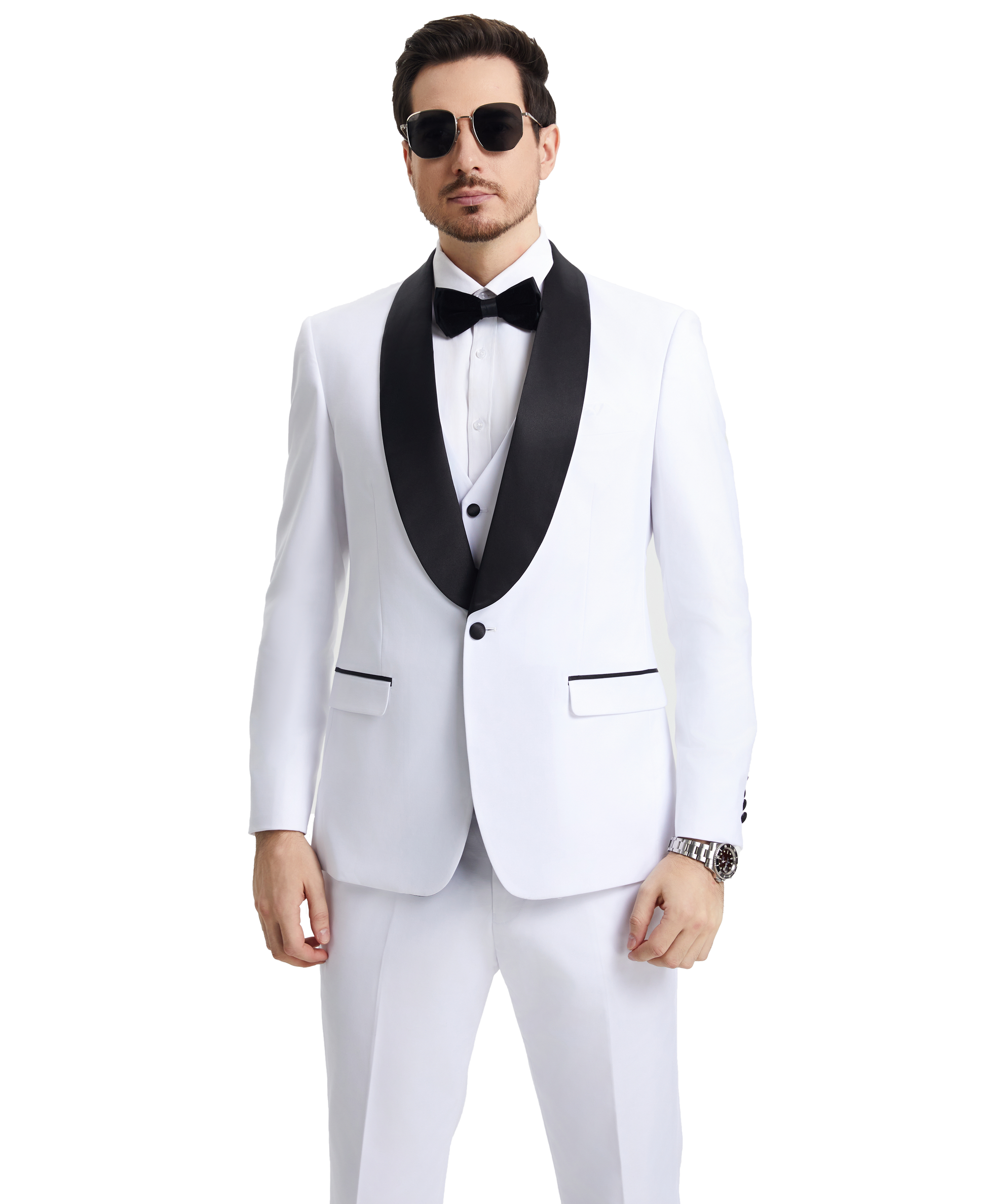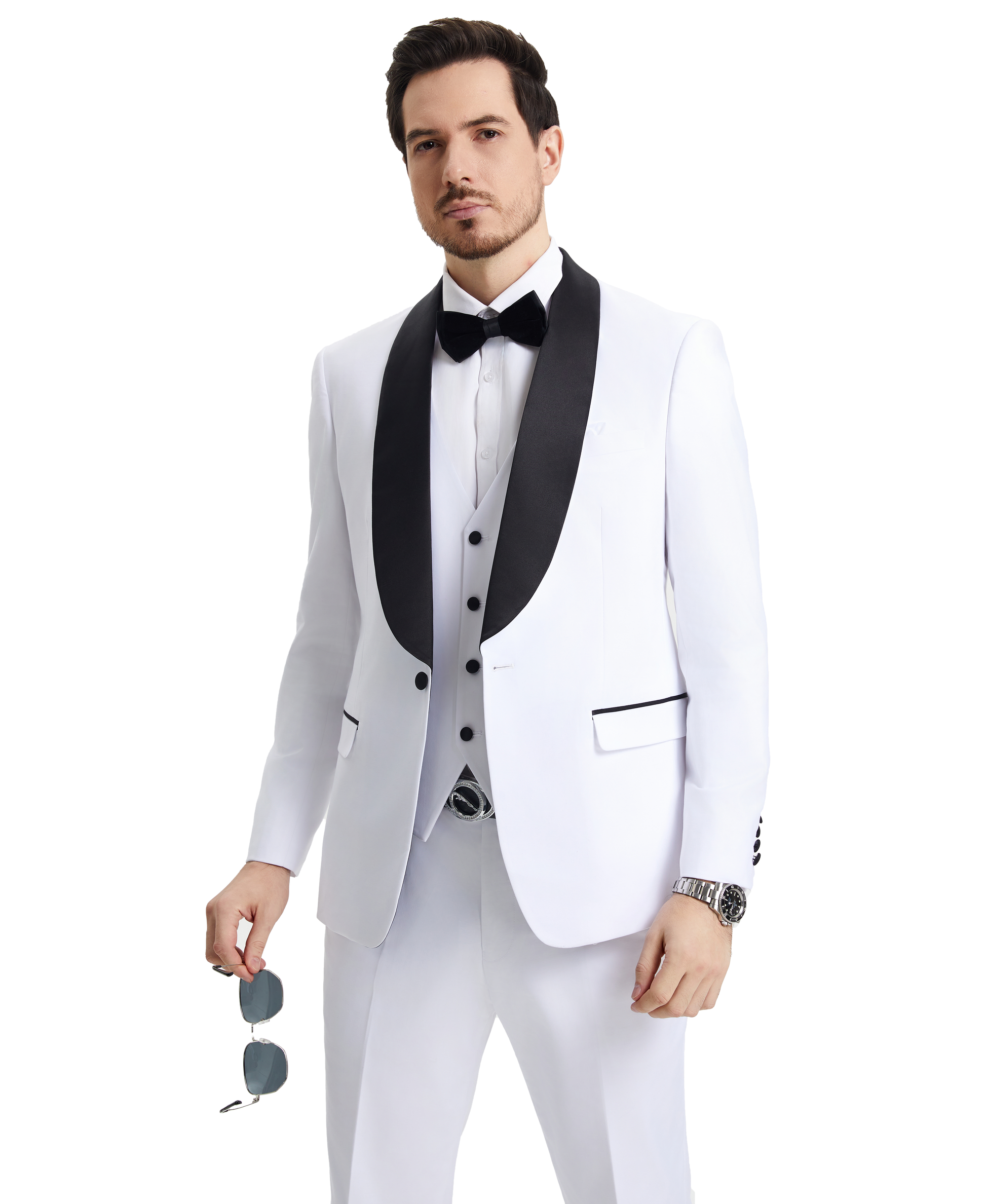 Introducing the Stacy Adams Hybrid-Fit Vested Tuxedo in Snow White, a pinnacle of timeless beauty and modern style. Crafted with care, this 3-piece suit will make a lasting impression at any formal occasion, be it a wedding, a black-tie gala, or any special event. It features a refined single-button fastening, a luxurious satin-black shawl collar, and pristine snow-white color for a timeless aesthetic. This timeless look is enhanced by its hybrid fit that combines modern tailoring and comfort, a flat front pant for a sleek look, and a versatile five-button vest. Plus, it includes valuable size options and unhemmed pants for customization. Make a statement with the Stacy Adams Snow White Tuxedo and enjoy Stacy Adams' renowned quality and style. Shop now to sparkle at your next event!